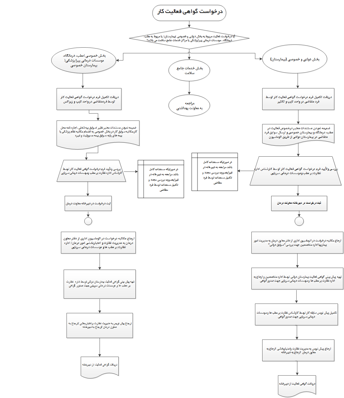 در مرحله درخواست | الکترونیکی /ثبت در دبیرخانه معاونت درمان | پزشکان و پیراپزشکان فعال درمطب و موسسات درمانی سرپایی | الکترونیکی | درخواست گواهی فعالیت و ارائه مستندات لازم |